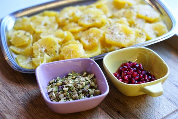 Lägg upp på apelsinskivorna på ett fint fat och häll över lite av kryddlagen.