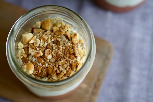 Det där med bra mellanmål som ger både näring och energi framåt eftermiddagen är inte alltid så lätt att få till. Jag har hittat en variant som jag verkligen gillar. Det är som ett kinderägg med tre önskningar i en. Frukt eller bär i botten, en blandning av chiapudding och turkisk yoghurt i mitten och en tuggig müsli på toppen. Just nu har jag äppelmos i botten eftersom vi nyligen skördat äpplena på vårt lilla äppelträd. På toppen har jag en müsli som hängt med ett bra tag nu. Receptet hittar du här. Egentligen kan man ta vad man haver så det blir alltid lite variation på blandningen. Visst är det gott med rostad müsli, eller granola som det brukar kallas, men det är så sjukt mycket snabbare att bara blanda ihop ett gäng frön och gryn i en burk så det alternativet vinner just nu.