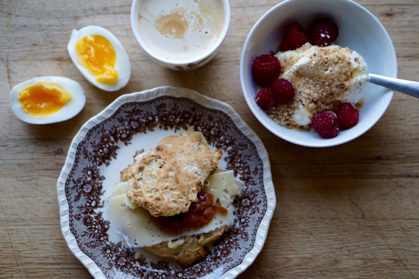 Först vill jag börja med en kopp te eller ännu heldre en kopp ljummet citronvatten. Sen tar jag yoghurt/fil med müsli/nötter och bär. Den äter jag helst i en liten skål med dessertsked, alltså en sked som inte är för stor och inte för liten (det är vikitgt med detaljer). Därefter brer jag en macka med ost och gärna en skiva gurka på toppen. Till det är det gott med ägg eller äggröra.